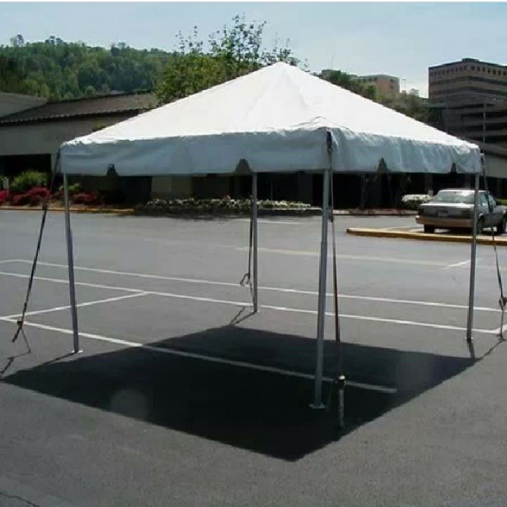 This is the 10x10 white tent. This tent can hold up to 2 tables and 16 chairs. Mostly used for parks and small events.